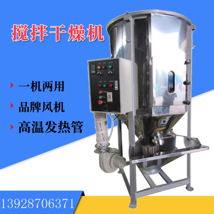 立式搅拌干燥机主要用于多种颜色塑料颗粒的混合,干燥机是注塑机、造粒机的必备配套设备之一,塑料粒子从进料斗进入,在螺旋叶片推进力的作用下,沿着叶片表面向上滑动前进在上部的离心力的作用下,向桶体四周散开,散开的物料不断向下移动,由循环出料口和桶内循环料口不断被螺旋叶片带动提升。这样反复循环,达到混合目的,与此同时空气经鼓风机送至电加热箱中,加热后成为热风再 经温控表自动控制,以均匀适合的热风从树脂之间一路穿透,穿过物料层,进行热交替不断带走湿气,树脂粒子由上而下,下降过程中连续不断得到吹扫干燥,完成高效率干燥和混合工艺。